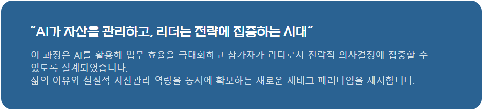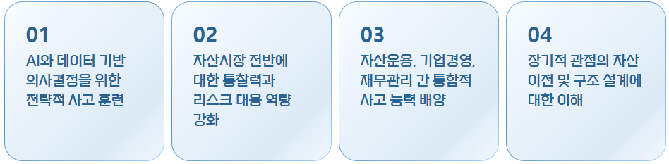 지속가능한 부의 구조를 설계하고, 이를 리더십으로 연결할 수 있는 자산관리 전략가로서의 기반을 다지게 됩니다.