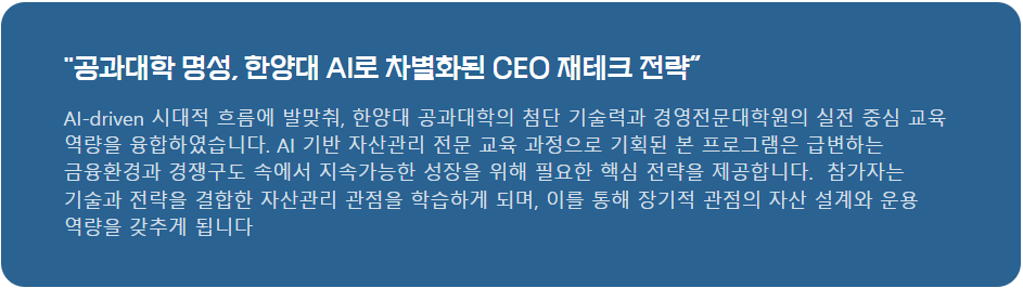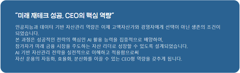 '미래재태크 CEO 과정'은 최고경영자 및 고위 관리자들을 대상으로 한 금융 · 자산 투자 중심의 심화 교육 프로그램입니다.